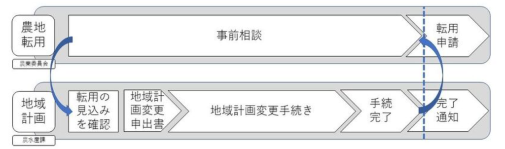 「農業経営基盤強化促進法」という法律改正により、高齢化や担い手不足等で農地の適正活用が危ぶまれる状況から将来にわたって農業を守るため、関係者の話し合いに基づき各市町村で10年先の地域の農業の絵とそれを実現するための計画を作る「地域計画」が策定されることが義務となりました。該当の農地がこの地域計画の対象地域である場合には、まずこの地域計画の対象から外してもらう(地域計画の変更)という申出をしなければなりません。